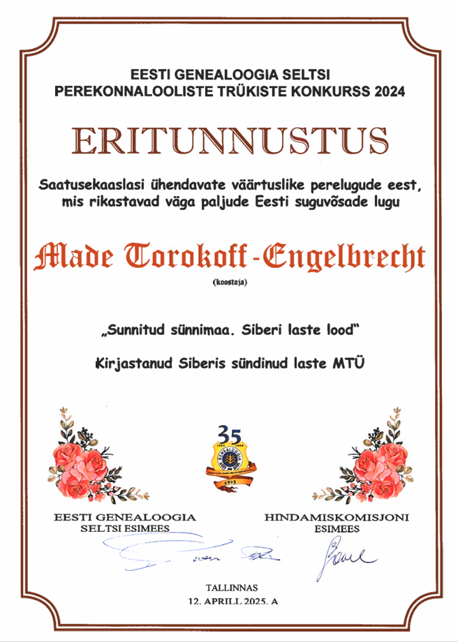 Eritunnustusi anti välja viis, neist ühena raamatule “Sunnitud sünnimaa. Siberi laste lood” (koostaja Made Torokoff-Engelbrecht). Konkursi toimkonna põhjendus eripreemia andmiseks meie raamatule: Sunnitud sünnimaa. Siberis sündinud laste lood – statuudi kohaselt ei kvalifitseeru perekonnalooliste trükiste konkursile, kuid annab elulugude kaudu ainest suguvõsauurimiseks ja sisaldab palju üle-eestilist genealoogilist materjali. Avab võimaluse, kuidas uurida oma perekonnalugu osana mingi välise ühendava teguri alusel ….. Huvipakkuvad on Siberi kaardid, kus on märgitud laste sünnikohad. Ilus ja väärikas. Valitud makett hoiab kaleidoskoopilise sisu väga hästi ühistes raamides (rääkijate ühes formaadis värvifotod täpselt ühes kohas iga peatüki algul, must-valgete fotode ühtlased read lehekülgede alumisel poolel). Korralikult toimetatud ja kujundatud, laitmatu vormistus. Eesti Genealoogia Seltsi perelooliste trükiste konkursi toimkond otsustas raamatule välja anda eritunnustuse, sõnastusega:Saatusekaaslasi ühendavate väärtuslike perelugude eest, mis rikastavad väga paljude Eesti suguvõsade lugu.